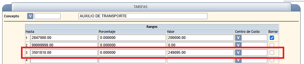 - Acción: Si el concepto del auxilio de transporte está formulado, actualiza su valor en este programa. Recuerda añadir el nuevo registro para 2026 y eliminar el tope para 2025