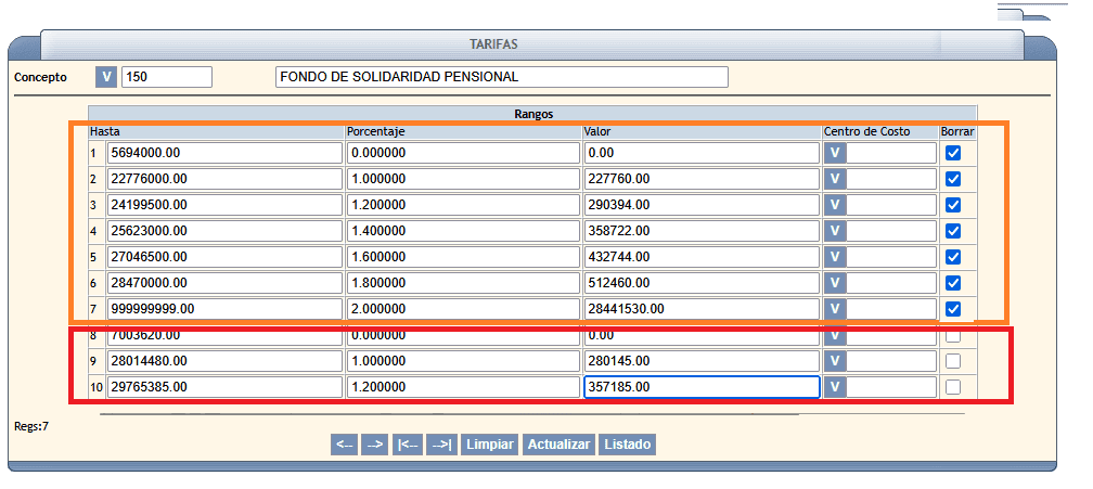 - Acción: Ajusta los topes correspondientes al concepto de Fondo de Solidaridad Pensional según las nuevas disposiciones. Recuerda eliminar las tarifas del 2025 (las enmarcadas en naranja) y crea las nuevas para 2026 (enmarcadas en rojo)